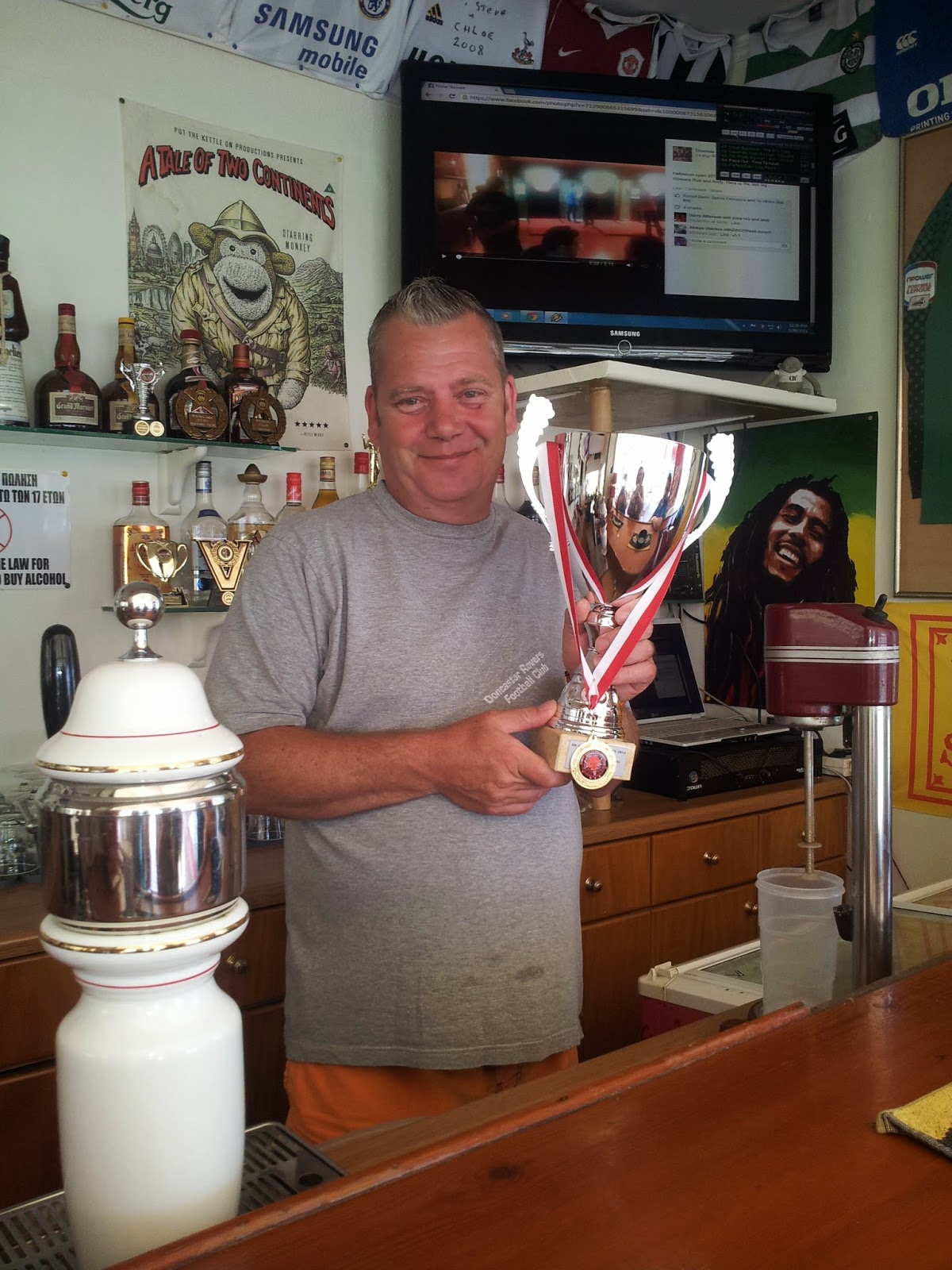 Andy had just got back from Athens, where he had been for the Greek open darts championship and he and his partner won the Doubles. Here he is with his trophy.